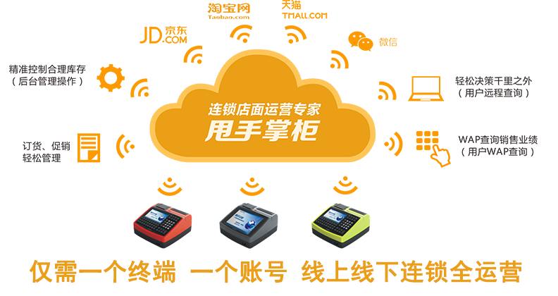 “甩手掌柜”基于機器互聯云平臺(TSP),通過整合嵌入式終端、移動互聯網技術和終端運維服務形成的一套連鎖專賣信息化解決方案,給連鎖零售企業提供一站式信息化服務,店家無需另行配置軟硬件、網絡或服務器,也無需組建專業信息管理團隊,就可實現門店信息的統一管理,只需在店面放置一臺帶收銀功能的無線終端,管理人員也可隨時隨地通過帳號登錄到云管理平臺完成所有店面管理的工作。 “甩手掌柜”不僅使連鎖企業實現對門店的運營管理,更通過TSP平臺實現“O2O無縫融合”以及精準營銷。