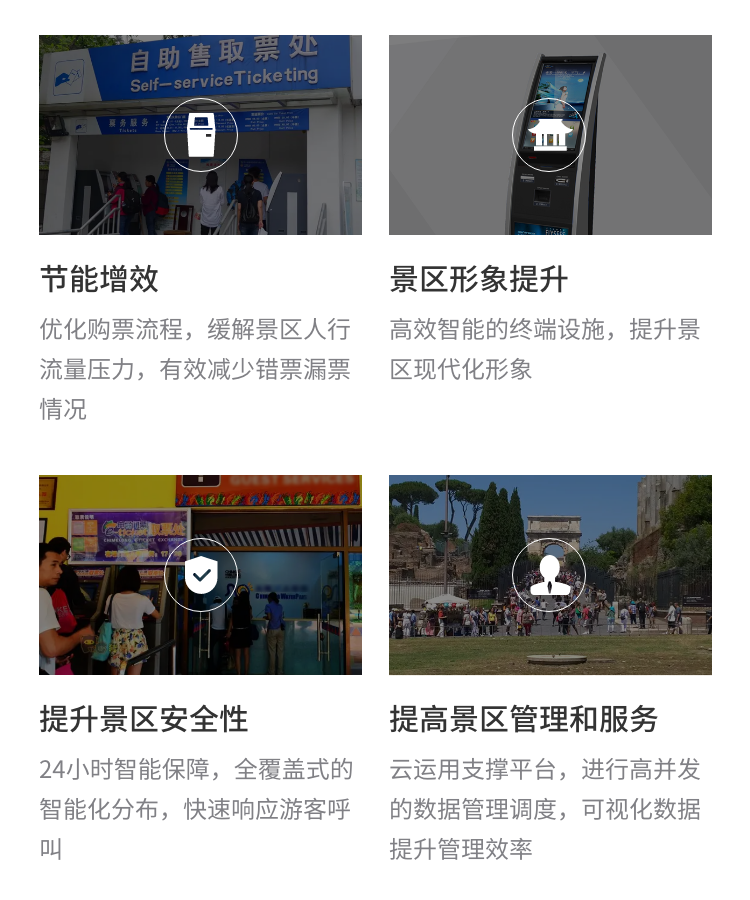 • 通過信息化、自助化服務(wù)提高景區(qū)工作效率、節(jié)省人力,降低運營成本