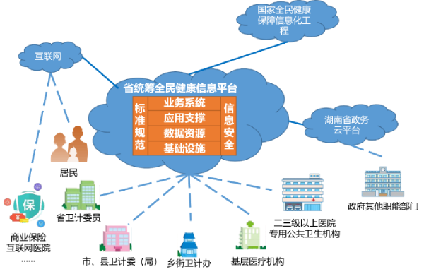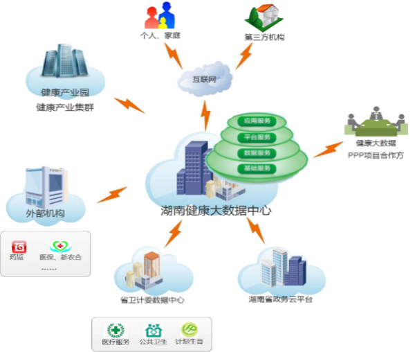 湖南健康大數據中心建設,一方面通過政策配套支持,與湖南省衛生健康委省級數據中心、湖南省政務云平臺以及相關外部單位對接,在政策許可、授權監管下,使用現有信息化成果與醫療衛生服務資源;另一方面,通過引入具有豐富經驗的醫療健康項目合作單位,基于健康大數據云平臺,建設“醫療健康+互聯網”應用,并面向個人、家庭、第三方機構開展運營工作,開展健康大數據應用,培育醫療健康服務產業。