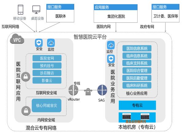 依托當地的IDC資源,通過建設公共云和本地專有云組成混合云模式,在保障業務安全、信息安全的前提下,支撐互聯網醫療應用的拓展及數據共享,構建區域智慧醫療混合云平臺