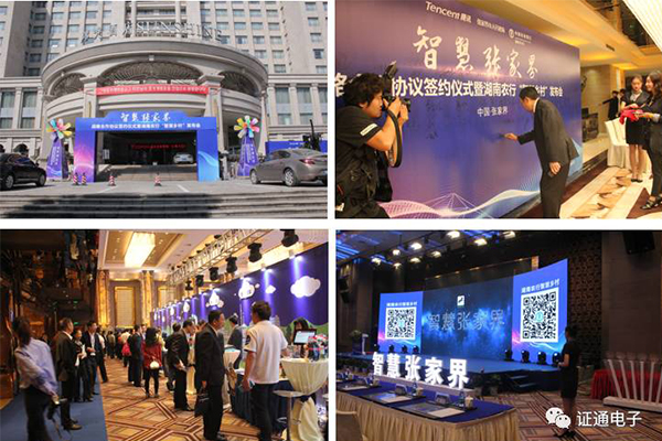 2017年11月3日,張家界市人民政府、深圳市騰訊計算機系統有限公司、中國農業銀行股份有限公司湖南省分行、深圳盛燦科技股份有限公司、深圳市證通電子股份有限公司聯合舉辦的“智慧張家界”戰略合作協議簽約儀式暨湖南省農行“智慧鄉村”發布會在張家界陽光酒店隆重召開。
