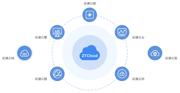 在功能組件上劃分為證通云棧、證通云臺、證通云池、證通云數、證通云固、證通云監、證通云管七大部分。