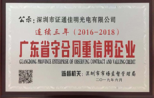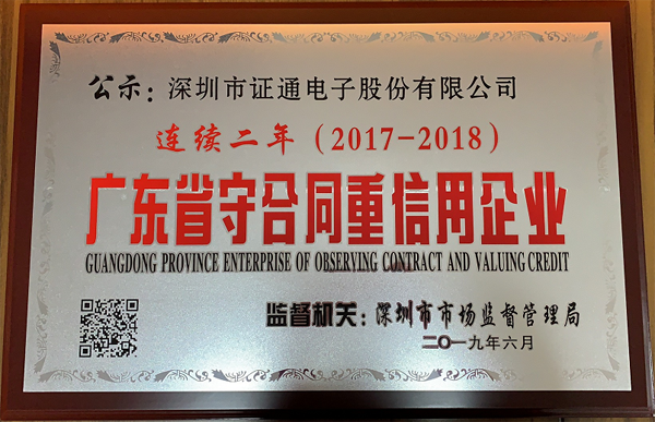 近日,深圳市證通電子股份有限公司及旗下兩家子公司(深圳市證通佳明光電有限公司、深圳市證通云計算有限公司)分別獲深圳市市場監督管理局授予的2018年度“廣東省守合同重信用企業”證書。