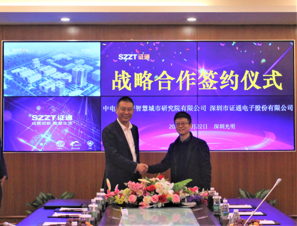2020年12月22日,深圳市證通電子股份有限公司(以下簡稱“證通”)與中電科新型智慧城市研究院有限公司(以下簡稱“中電科智慧院”)在證通電子總部簽署戰(zhàn)略合作協(xié)議,此次合作聚焦于智慧城市領(lǐng)域,結(jié)合雙方在行業(yè)需求、技術(shù)研發(fā)、項(xiàng)目運(yùn)營等方面的資源和經(jīng)驗(yàn),基于各類場景以不斷豐富產(chǎn)品、完善解決方案,更好的助力城市的智慧發(fā)展。