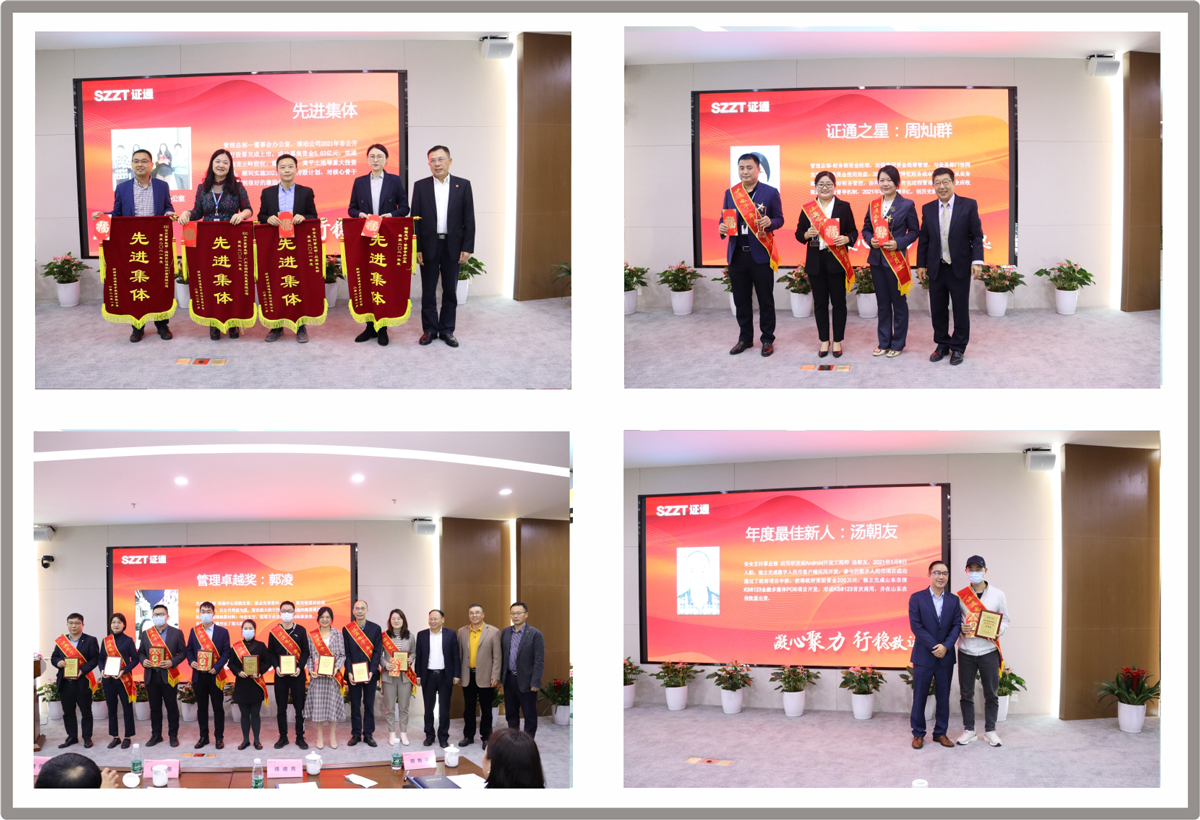 隨后進行的是優秀員工表彰環節,IDC云計算事業部——深圳市證通云計算有限公司、廣州云碩科技發展有限公司,安全支付事業部應用研發部、管理總部董事會辦公室在疫情影響下積極進取,取得優秀的成績與貢獻,榮獲2021年度先進集體稱號;IDC云計算事業部林光州、自助科技事業部康亮、管理總部周燦群在2021年度奮勇拼搏、創新實踐、管理優秀,業績突出,榮獲證通之星稱號;IDC云計算事業部何炬、自助科技事業部張旭芳、安全支付事業部汪高磊獲得市場先鋒獎,自助科技事業部鄧君臣、郭斐和安全支付事業部丁鼎獲得技術創新獎,IDC云計算事業部李秋平、黃志清和光電事業部郭凌獲得管理卓越獎,安全支付事業部湯朝友獲得年度最佳新人獎,公司高管團隊分別登臺為他們頒發了榮譽證書和獎金,優秀員工代表林光州代表優秀員工進行了發言。