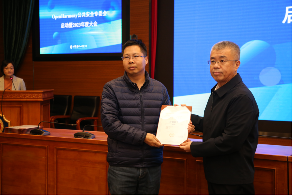 OpenHarmony項目群生態委員會公共安全專委會是OpenHarmony生態在公共安全行業的實踐推廣先鋒,致力于公共安全OpenHarmony項目群開源生態建設,以警鴻操作系統為抓手,發揮行業引領和輻射作用,帶動整個公共安全行業移動應用的變革。余兵副所長代表一所致辭并為證通公司頒發OpenHarmony公共安全專委會會員證書。他表示:公安部第一研究所擔任OpenHarmony生態委員會公共安全專委會會長單位,本著維護國家政治安全的責任,勇于擔當、守正創新的信念,為公共安全行業創建自主可控的移動信息化產業生態,一所將充分發揮行業引領和輻射作用,帶動整個公共安全行業移動應用變革,與生態委員會、華為公司以及各會員單位一起推廣公共安全OpenHarmony操作系統技術,共建安全可控的OpenHarmony應用體系。