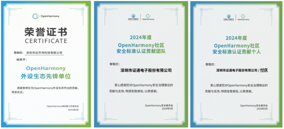 伴隨“春筍行動(dòng)”啟動(dòng)的熱潮,證通還主辦了的OpenHarmony外設(shè)生態(tài)閉門(mén)會(huì)議,聚焦OpenHarmony外設(shè)SIG技術(shù)發(fā)展規(guī)劃、OpenHarmony外設(shè)工作組發(fā)展規(guī)劃、OpenHarmony外設(shè)認(rèn)證工作進(jìn)展及規(guī)劃等方面發(fā)表了主旨分享,深度剖析了OpenHarmony在外設(shè)生態(tài)技術(shù)演進(jìn)路徑和發(fā)展規(guī)劃。在交流討論環(huán)節(jié)就如何加強(qiáng)生態(tài)合作和如何加速推動(dòng)OpenHarmony外設(shè)應(yīng)用的創(chuàng)新與落地等議題進(jìn)行了深入討論,為外設(shè)生態(tài)的未來(lái)發(fā)展繪制了宏偉藍(lán)圖。OpenHarmony外設(shè)生態(tài)閉門(mén)會(huì)議在本次大會(huì)上,證通憑借著在開(kāi)源技術(shù)創(chuàng)新與生態(tài)貢獻(xiàn)上的杰出表現(xiàn),榮獲“OpenHarmony外設(shè)生態(tài)先鋒單位”、“2024OpenHarmony社區(qū)安全標(biāo)準(zhǔn)認(rèn)證貢獻(xiàn)團(tuán)隊(duì)”、其中證開(kāi)鴻副總經(jīng)理付慶獲得“2024OpenHarmony社區(qū)安全標(biāo)準(zhǔn)認(rèn)證貢獻(xiàn)個(gè)人”,這些榮譽(yù)不僅是對(duì)證通這一年來(lái)深耕OpenHarmony生態(tài)所取得成績(jī)的認(rèn)可,也彰顯了其在全球開(kāi)源領(lǐng)域的重要地位和深遠(yuǎn)影響,更為其未來(lái)的發(fā)展之路增添了更多期待與動(dòng)力。隨著2024開(kāi)放原子開(kāi)源生態(tài)大會(huì)的圓滿落幕,證通以實(shí)際行動(dòng)證明了其在開(kāi)源技術(shù)與OpenHarmony生態(tài)建設(shè)中的領(lǐng)先地位。展望未來(lái),證通將繼續(xù)秉承開(kāi)放共享、合作共贏的理念,攜手合作伙伴,共同開(kāi)啟數(shù)字中國(guó)的輝煌篇章。
